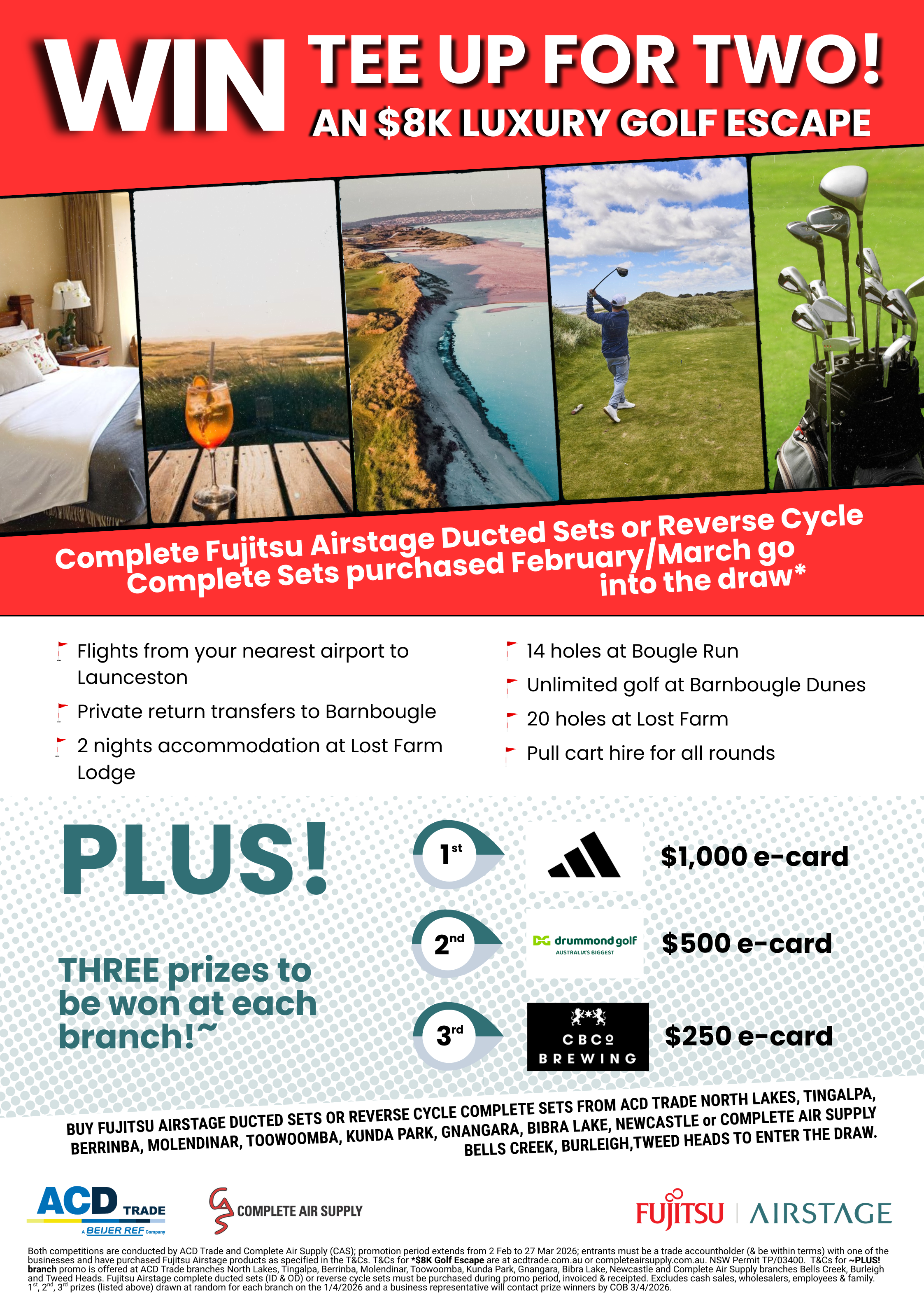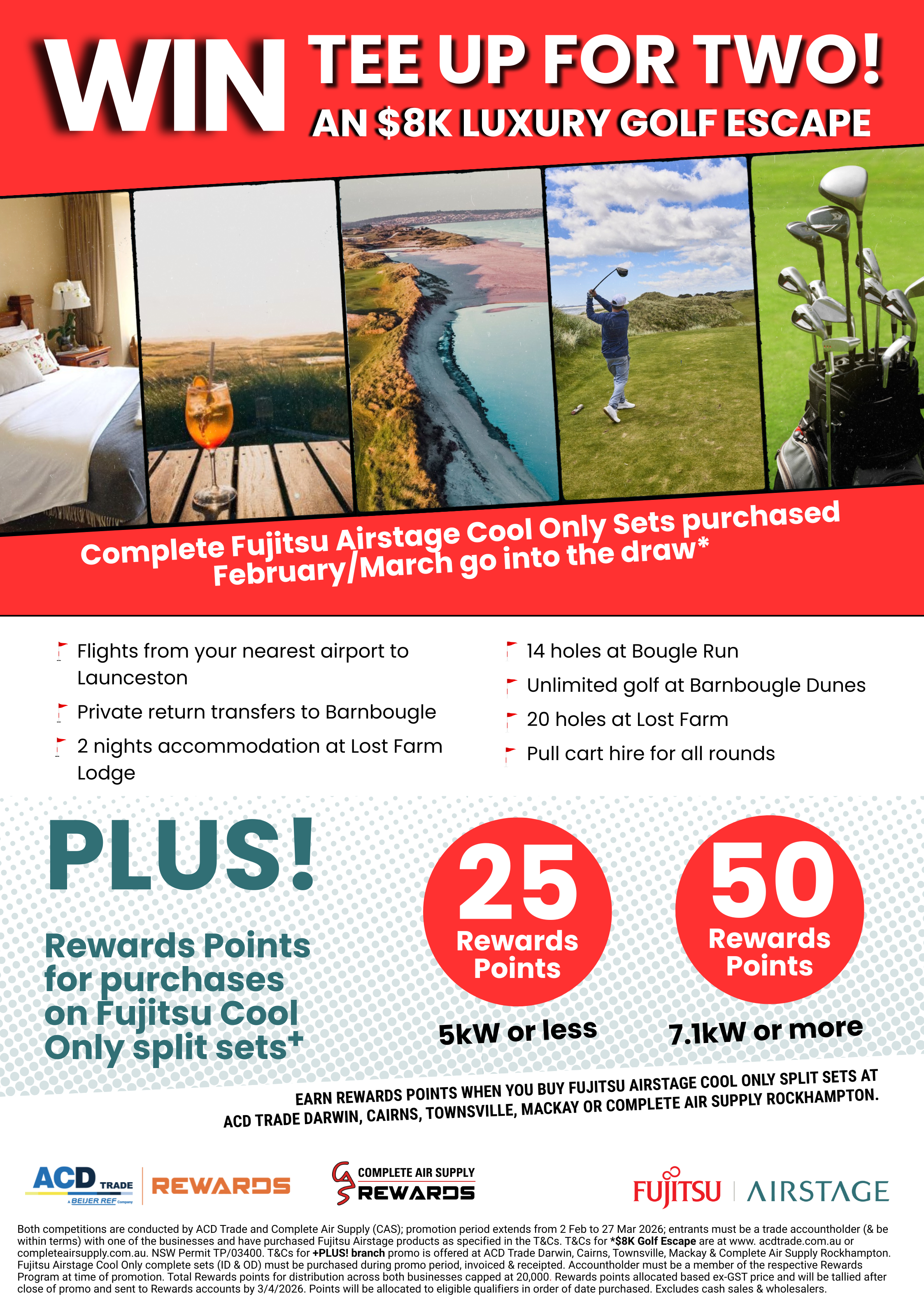 Step into the season with an incredible new Fujitsu promotion available exclusively to ACD Trade and Complete Air Supply trade account holders! Whether you're installing eligible split systems, cool-only units, or ducted systems, Fujitsu purchases made during the promotional period could put you in the running for amazing prizes — including a luxury golf holiday valued at up to $8,000.
